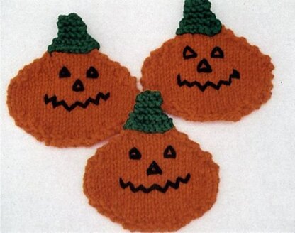 A good way to use up that orange yarn, and make something useful! Nice to keep these coasters on your desk, or how about knitting up an extra one for the teacher! Easy embroidered face on pumpkins. These knit up rather quickly, so you can make a whole set of these for a gift. Uses worsted weight yarns, knitting needles, US # 7. Finished size is about 4 by 4 ½.