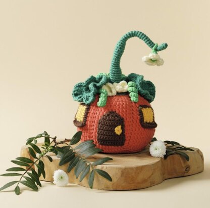 This whimsical pumpkin house is the perfect autumnal decoration and just waiting for tiny gnome or fairy residents. With its curved stem, vines, windows and floral details, it makes an enchanting handmade home. The pumpkin is worked in the round and shaped with strategic decreases. Add charming accessories like a door, windows, and curly vines for the full cottagecore look.