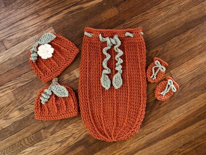 This adorable pumpkin snuggle sack cocoon set will keep baby warm during fall weather. The pattern includes complete written instructions for 4 items: pumpkin cocoon, 2 sizes for hat (0-3 month and 3-6 month) and mitts. Perfect for a fall photo prop. Quick and easy pattern.