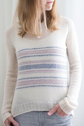 Worked in a wonderful merino and mohair blend yarn, this sweater is incredibly soft and lightweight. It’s worked seamlessly from top down, shaping the neck and hem with short rows. The delicate slip-stitch stripes make a nice detail. The sweater is designed to be worn with 3” / 8 cm of positive ease which is already built into each size. Shown in size S.