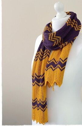 Purple Gold is a lacy two-color scarf worked in a fun Tunisian crochet chevron pattern. The name is the two shades of the lovely Lace Scrumptious by Fyberspates used in this design.