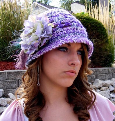This Crochet Hat is beautiful and the Crochet Pattern is easy! This Toque features a puple peony with ostrich and peacock feather embellishments. You or that special loved one will look stunning in this crocheted hat. Change the Flower and Feathers, or just leave the feathers off, and you have a different look