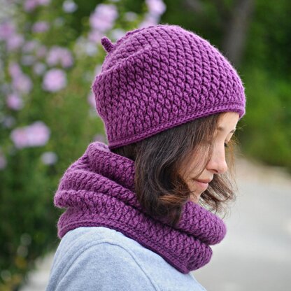 Purple Pine is a hat and cowl set, both pieces are crocheted in the round using the post-stitch technique. The stitch pattern, which mimics the scale pattern of a pinecone, is stretchy, so bear this in mind when choosing the hat size. A little stem gives the hat a cute final touch, however, you can skip it.