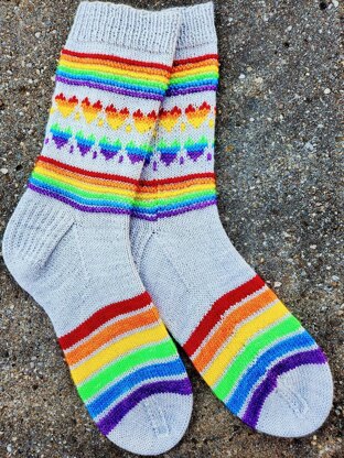 The amazing rainbow micro 10g sets just screamed for some stripes and colourwork. The colourwork hearts are easy to knit and I only caught the floats on two of the rounds. I wove the ends in as I went on the stripes but did the hearts after I finished the sock to keep the tension loose enough.