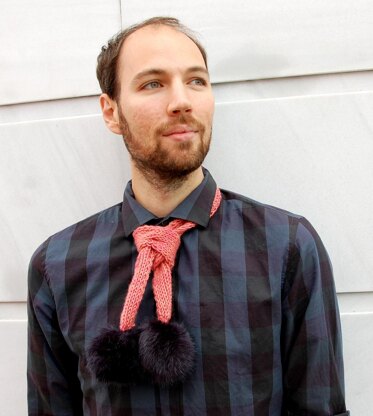 This is a pattern for a fun little scarf. It is a basic rib stitch, knit flat, with a repeated cable motif. You may add pom-poms at either end...faux fur or made from yarn.http://designers.loveknitting.com/#/design/new/about