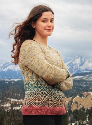 Quadratis is a top-down seamless yoke sweater. It has short rows at the back of the neck, and simple yoke in one colour. After dividing the body and arms, stranded colourwork forms a pattern which increases in dominance as it moves towards the hem. Waist and hip shaping can be added with the changing of needle sizes if required. The cuffs are finished off with a colourful pattern that echoes the body of the sweater.