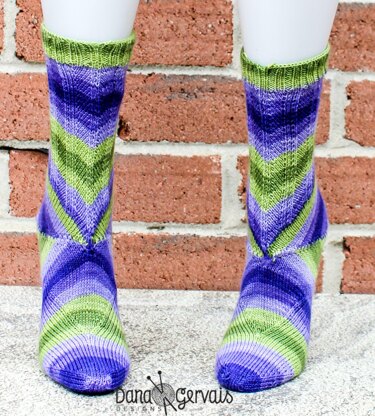 This pattern was designed specifically with self-striping and self-patterning yarn in mind. This sock starts with the heel which creates a hub from which the yarn spreads in different directions. This sock uses a unique combination of cuff-down and toe-up sock techniques.