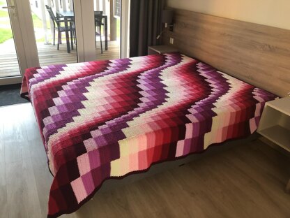 The 3D-looking wave is created by keeping the height of each row the same (by using the dc block) but changing the width of each column (by increasing and decreasing the number of stitches). It is worked corner to corner, right to left.