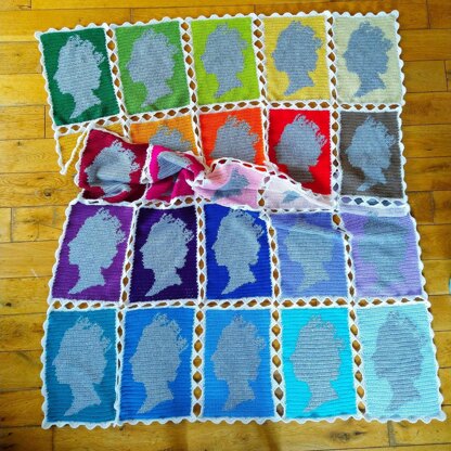Pattern of an unusual crochet blanket made of 25 iconic "postage stamps" with Queen Elizabeth II profile. Super stylish addition to any room, a great git for royal family and Queen lovers or stamp collectors.