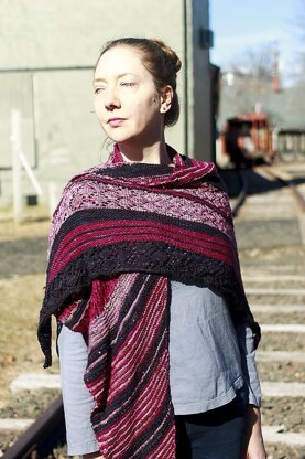 A generous sized shawl that features garter stripe sequences and progressively larger diamond lace repeats. Knit sideways, you begin with a few stitches, and increase every right-side row to form an elongated triangle that is great for wrapping around your shoulders.