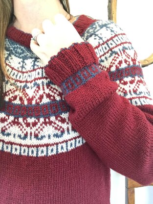 This pullover uses DK weight yarn and is knit from the top down seamlessly in the round. This garment is full of color with a beautiful yoke motif and double knit ribbing along the sleeves, neck and waist (this adds strength and a pop of color.) This sweater is great for any knitter with minimal floats and lots of fun. Colorwork is Chart only.