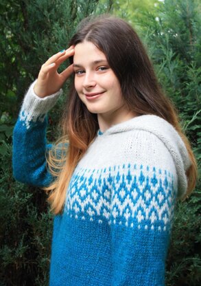 Quiescence is a seamless top-down yoke sweater which can be knitted either with or without the hood. It features stranded colorwork around the yoke, which starts with a pale, neutral contrast color, and inverts into a vivid main color. There are short rows at the neckline for a comfortable fit, and optional waist shaping to add feminine shape. The hem is finished off with bold ribbing, while the cuffs are completed with stranded colorwork that echoes the yoke.