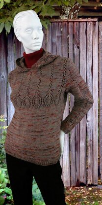 If you want the perfect balance between super-casual hoodie and an elegant pullover, here's your answer! The lace pattern across the chest is also worked on the sleeves and edge of the hood. Some waist shaping creates a more flattering fit. The sample was worked in a hand-painted yarn; when choosing yours, make sure the colorway is not super busy so as to show off the lace pattern to its best advantage. This design will look great in solid, semi-solid or heathered colors, too!
