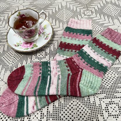 These socks are a simple and fun way to knit scrappy socks! The colourwork is mosaic, so they are knit with one colour at a time. The pattern works well with mini skein sets or can be knit completely scrappy. The pattern is easy to memorize once it’s established.