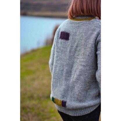 The sweater starts with two saddles in cable pattern and is worked top-down. The back and the front are worked flat, back and forth, from the stitches picked up along the saddles. The body is joined at the armhole level and worked in the round to the waistband, with lateral faux seams and optional color block intarsia. After the body is worked, the stitches for the sleeves are put back on the knitting needles and worked in the round, top-down to the wristband, with an original cable pattern, reverse stockinette stitch and faux seams.
