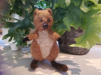 This 11 cm quokka has a 9 cm tail and was made on 2.25 mm dpn (UK 13, US 1) in Lana Grossa Silkhair (115) golden brown, Lopi Einband (0885) oatmeal heather, (0887) chocolate and (1038) light beige heather and Rowan Kidsilk Haze (686) lustre. Both the color and texture of your yarns determine the outcome of quokka, so adding a strand of mohair to the base yarn and/or adding a greyish ply of yarn to a brown base will create the rugged, agouti colored coat.