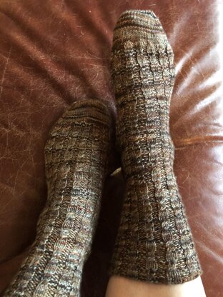 The socks are written & test knit for 3 sizes: adult S, M & L. Test knitters rated this a beginner pattern.