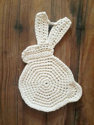 Gorgeous rabbit potholder made using ribbon yarn.