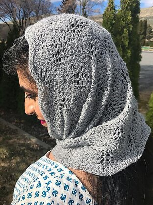 A rabi is a spring breeze which, while it brings the warmth, can still chill a person fooled by the brighter, sunny days. This wimple can be worn scrunched down or up around the face in the spring (or any other time) to give a bit of soft protection against such a breeze. Calling on the frequent use of birds and feathers in Persian art, the stitch pattern imitates ostrich plumes. Subtle shaping allows a closer or more loose fit, as desired. This is a great first project for laceweight yarn.