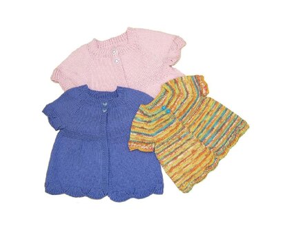 This is a really sweet swing-type cardigan with easy raglan shaping. To get different sizes in this pattern, you use fingering weight and size US 3 needles for 0 - 9 months; use dk weight and size US 6 needles for 12 months to 2 years; and use worsted weight and size US 8 needles for size 3 - 4 years. You don't need to circle different size stitch numbers or counts for different sizes, as they are all worked the exact same way!