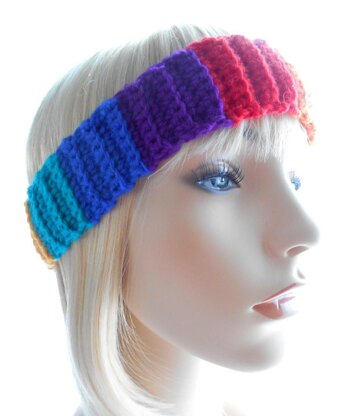 Back-loop single crochet creates a ribby headband of rectangular blocks in colors of the rainbow. This quick-and-easy project uses 6 colors of worsted-weight yarn, and only a few yards of each color.