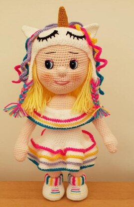We would like to introduce to you 'Rainbow' The Unicorn Girl, she is worked in basic stitches and rounds and stands at approximately 20" tall in DK so may turn out bigger if using Aran (Worsted 10ply), this pattern consists of 22 pages and includes the following:-