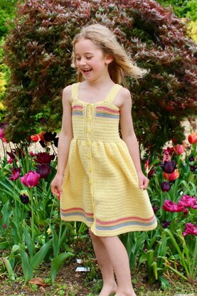 The Rainbow Dress is truly a beginner friendly pattern. If you know how to half double crochet and chain, you can make this dress!!! First the bodice of the dress is stitched. Next you make a ruffle row by working into the front and back loops of each half double crochet, the pattern includes a handy video tutorial. Then it’s time to make the skirt which takes some time to make but will be worth it in the end. When your skirt is complete, the inside edging is worked up both sides of the dress. The last step is to make 2 straps and sew them onto the bodice of the dress. So easy! The colour combinations are endless and your little one will look so cute in her beautiful Rainbow Dress! The best part is you can wear this dress with the buttons in the front or the back!