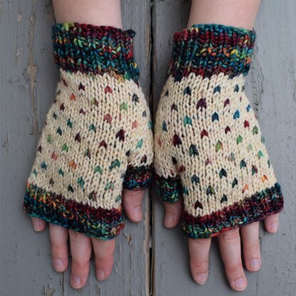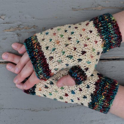These beautiful handwarmers were inspired by the gorgeous colours of the rainbow and the rain as shown by the fairisle detail which looks like rainbow rain drops. This design is part of a collection of four patterns with the Rainbow Drops motif (which includes leg warmers, hand warmers, pullover, and cowl).