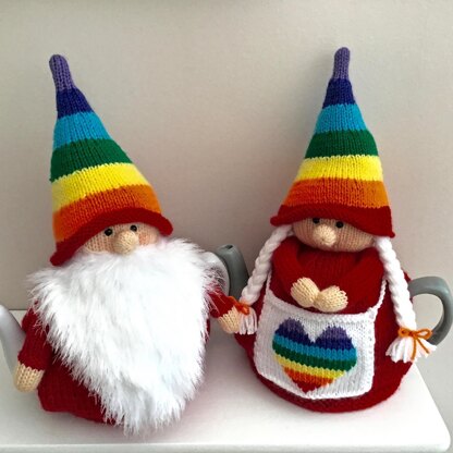 For each cosy: You will need approx 70g of red yarn and less than 5g of the other rainbow colours. You will need 10g of white for the girl gnome.