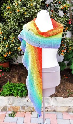 Rainbow is a slender, long piece, shaped like a half-moon, with an unobstrusive hole-pattern band. Crafted with Wollium’s gradient yarn, the colors will pop with this shawl’s shape.
