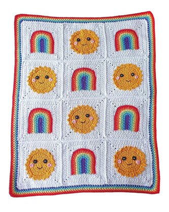 This bright and fun baby blanket is made by making rainbow and sunshine granny squares, then crocheting together with a slst. Then adding a moss stitch border.
