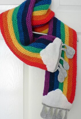 This colourful & cosy scarf is guaranteed to brighten up even the dullest Winter's day. It has been knitted in simple Garter Stitch in one flat piece, using a circular needle in order to accommodate the large number of sts. The clouds & raindrops are worked as flat pieces in Stocking Stitch, on a pair of single point needles then stitched onto the finished scarf.
