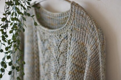 “Rakuyou”, falling leaves in Japanese, is a boxy pullover with leaves pattern on the center front. The pullover is worked from the top down. The fronts and backs are provisionally cast on and German short rows are used to shape the shoulders. They are worked back and forth separately to the underarm, then joined to be worked in the round to the hem. On completion of the body, the shoulders are seamed with three-needle bind off, then sleeves stitches are picked up and worked from the top down in the round.