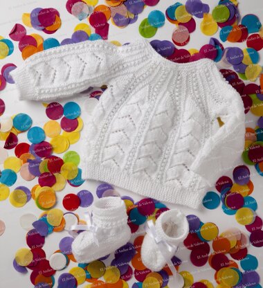 Product for digital download containing the instructions to make a classic wool and pearl sweater and matching bootees for a newborn baby, knitted in white. The instructions include the description of the materials required to make the outfit and the needle size used.