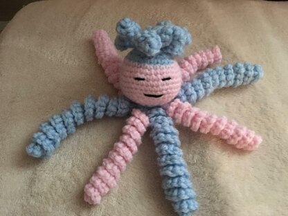 Using just 7 to 9 yards of yarn, this adorable octopus was originally designed for donations to NICU wards of various hospitals. Because I love making them, I also have made them for baby showers, newborn gifts, etc. Have you noticed that newborns clench their fists? These are perfect for them to clench and hold and later on to cuddle with! You can enjoy experimenting with different colors and decorations (bows, hearts, etc.) and just have lots of fun. My yarn preference for these little babes is a nice soft cotton such as Paintbox cotton yarn but any soft yarn will make an adorable little đ