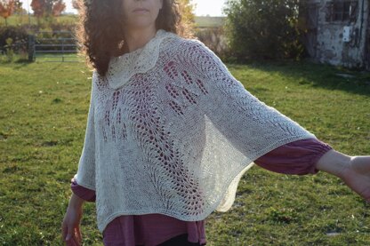 Rasa's Shoulder cape is a cowl neck cape in a delicate shale and leaf lace pattern. The Cape is worked from the neck down to the bottom edge, with increases incorporated into the lace patterning.