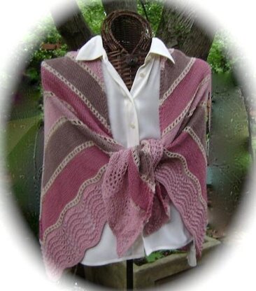 An easy knit, particularly for color knitting; the finished shawl is half-hexagon in shape, very ample, and fits on the shoulders nicely. It would be equally nice (with a very different look) if done in tone-on-tone color scheme.