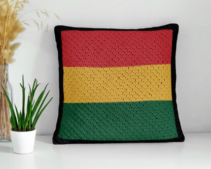 Striped Rasta Pillow crochet pattern designed with the mini Corner-to-Corner (C2C) crochet technique. Diagonal bands of red, yellow, and green create a bold reggae-inspired look. Perfect accent cushion for Jamaican style interiors, cultural décor, or handmade gifts with a vibrant personality.