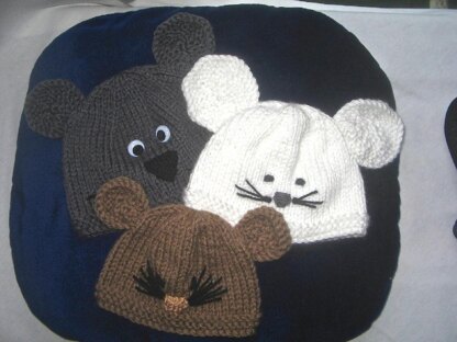 Called Rat Hat because I couldn't resist the sound of it, but really it is a Rodent Hat being a pattern for a mouse, or a dormouse, or a rat, or a – well, anything with big round ears... Pattern has 3 sizes for ears and 2 for noses. There's a pattern for a bonus bow as well. This is an easy knit for beginners.