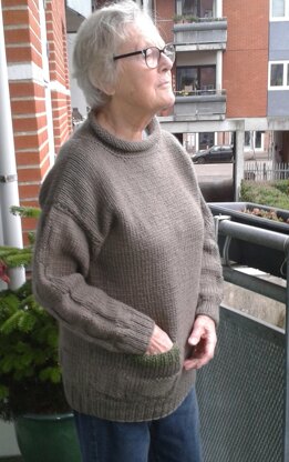 RAVANUSA, lovely big sweater with pockets. Worked flat. The pattern is simple - stocking st with a border in a textured pattern worked from chart. The sleeves are drop-down sleeves. High collar or hood - both possibilities in pattern.