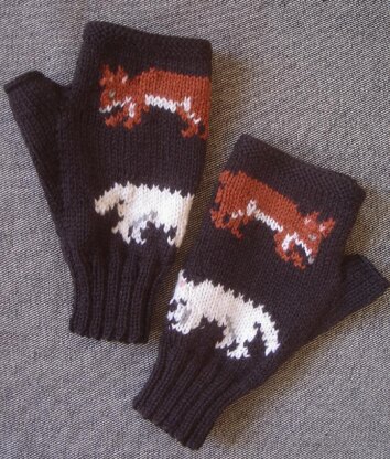 Fox fingerless gloves/mitts - hand-knitted in 4ply weight wool with a rust rox at the top and a white Arctic fox at the bottom on the fronts of the gloves. The backs of the gloves are plain.