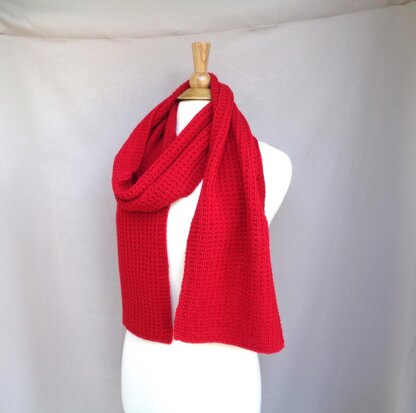 A wide, cozy scarf with a textured waffle stitch that is easy and relaxing. The simple bark-like texture is great for men and women.