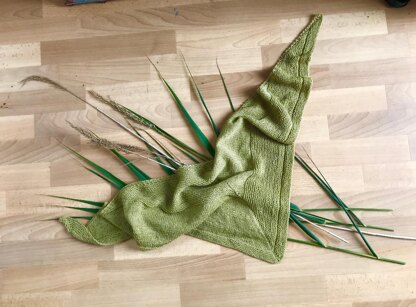 This pattern knits up into an elongated equilateral triangle. The seeming simplicity of the design and stitch work providing an excellent showcase for artisan and specialist yarns.