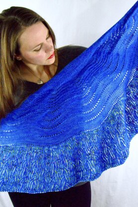 Reflection shawl, with a simple beginning that waves into ripples, ending with flecks of color. It will keep your mind calm and your hands busy, giving you time to reflect.