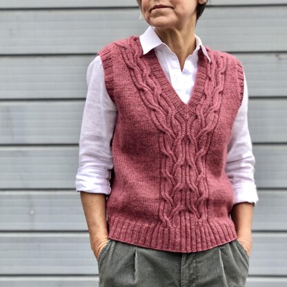 This design is a modern take on a classic cabled vest. It is intended to fit with approximately 2-5 inches of ease, and the shoulders are designed to be just slightly dropped. There are 2 fit options: the Women’s version which has more room in the front than the back for sizes L - 6X, and the Unisex version which has equal front and back widths.