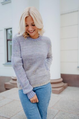 The sweater has seamless construction, worked from top to bottom. It is started with casting on stitches for the back, short rows are worked to elevate the shoulders. Then the left and right front shoulders are shaped separately with short rows. Next, the shoulder cap stitches are picked up and shaped further with increases. The front neckline is shaped at the same time. The piece is then joined to work in the round, and sleeves and body are shaped with further increases. After the full circumference is reached, the sleeve stitches are placed on hold and the body is joined in round, casting on additional underarm stitches. The body is worked in the round until the hem. Sleeves are picked up and worked in the round until the cuffs. Finally, the neckband is picked up and worked in 2x2 rib for double height, then folded in and sewn.
