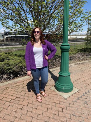 The cardigan is designed with 4-6” of positive ease. This means the finished sizes listed will be 4-6” more than your bust size. The original purple cardigan is a size large worn with 4” of positive ease. For a more fitted cardigan, go down a size.