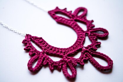 The Reine Necklace is a quick and easy statement necklace wonderful for using up scrap yarn. It goes especially well with boat-neck tops and summer dresses.