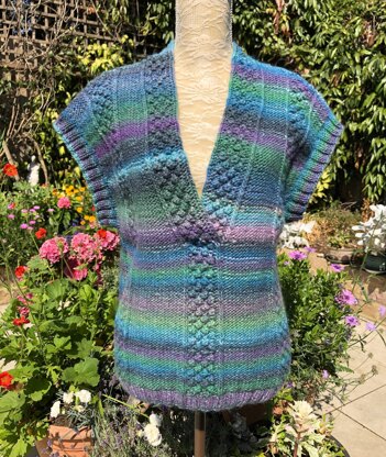 Vertical bands of blackberry stitch adorn this versatile and useful top. The deep cross-over V neck has borders worked in one with the front, which continue round the back of the neck, joined together at the centre. Worked bottom up and with full written instructions.