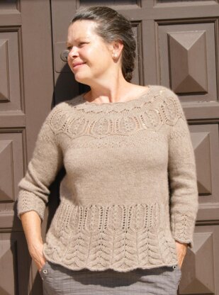 This sweater is worked seamlessly from the top down. At the top of the yoke some short rows are worked to lower the front neckline. The yoke is worked in the round featuring lace and textured stitches. Sleeves and body are separated and worked top down. Optional A Line shaping makes a flattering fit.